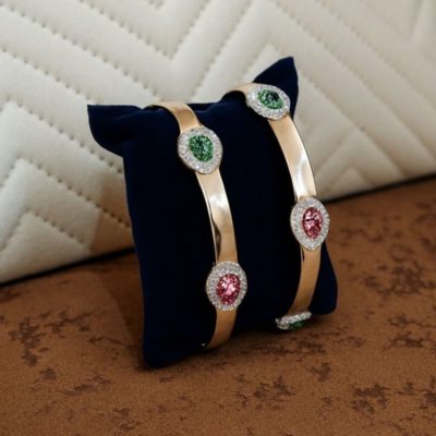 Elegant rose gold bangles adorned with sparkling pink and green...
